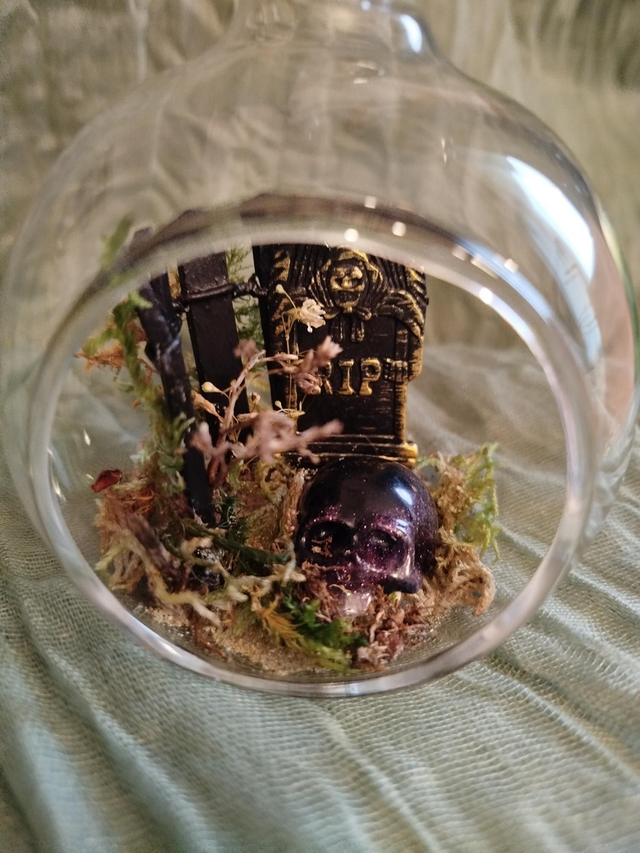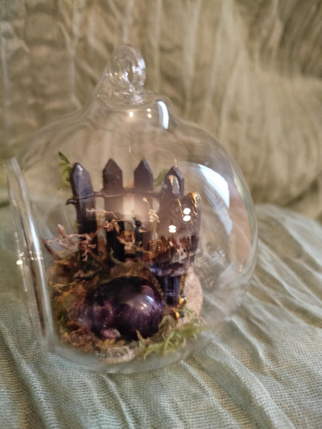 Boule en verre 8cm, décor végétaux séchés et scènes variées ( résine, pâte polymère... Dépend des modèles), vendu avec son pied noir.