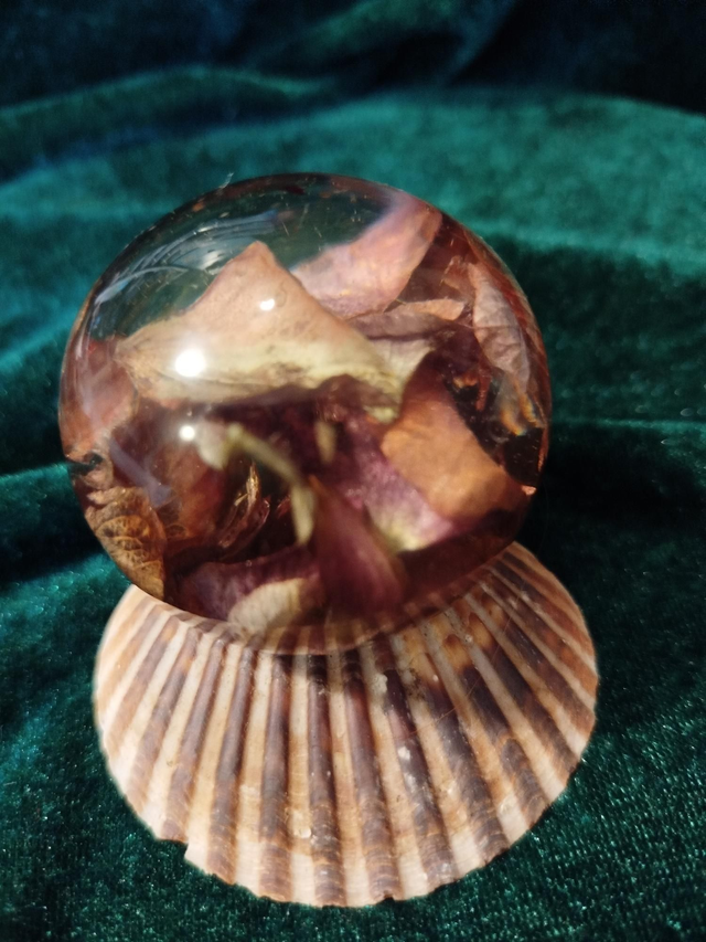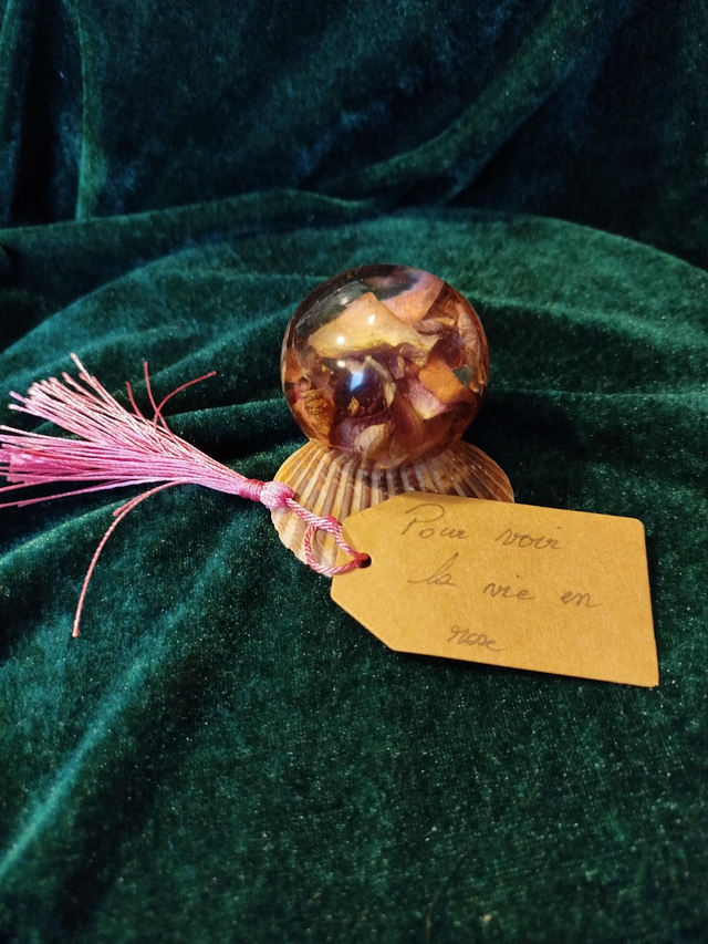 Boule en résine diamètre 6cm, pétales d'hortensia rose, coquillage