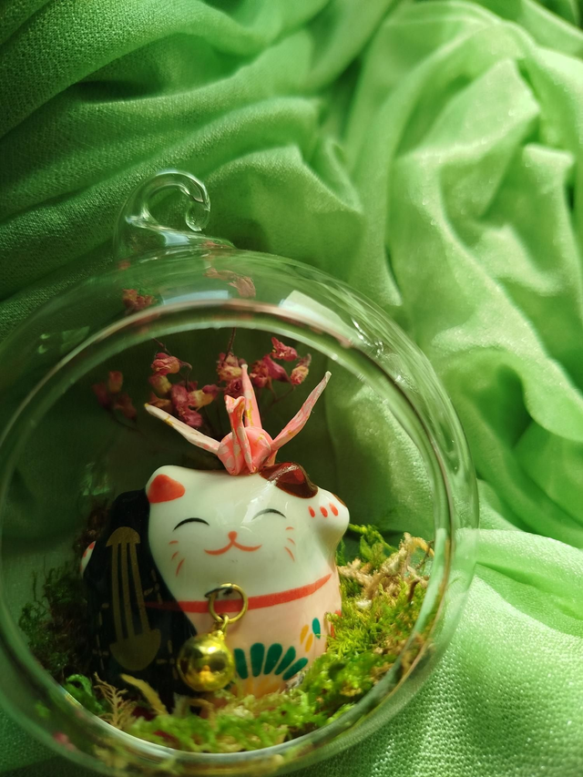 Boule maneki neko avec instrument et grue roses