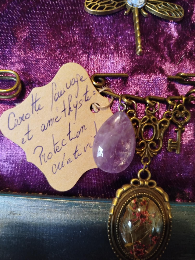Broche métal, végétaux récoltés et séchés sur place, améthyste