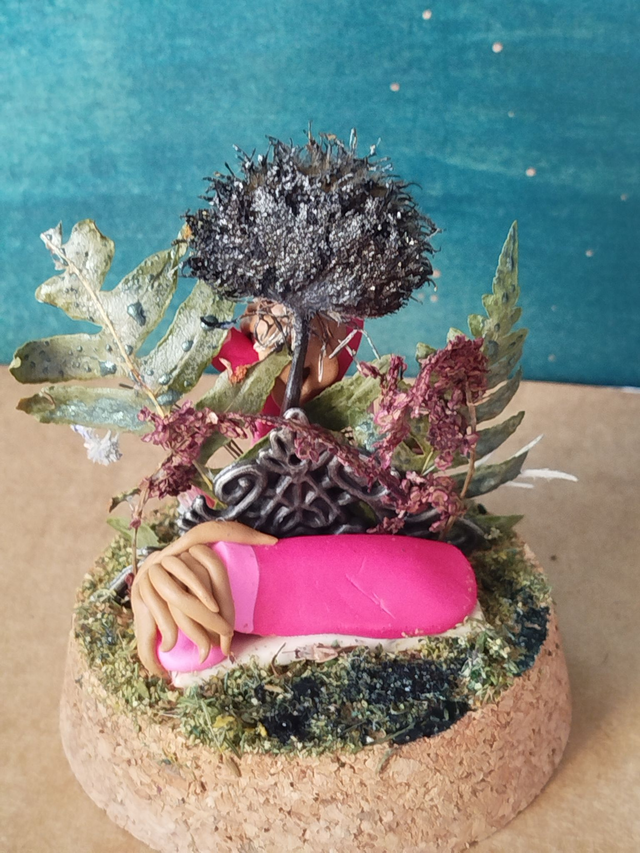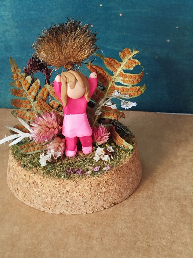 Bulle en verre, socle en liège, végétaux séchés, pâte polymère