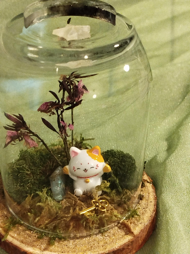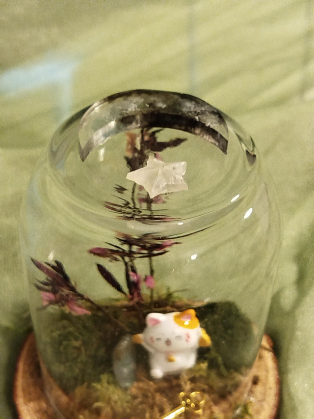 Golden verre environ 10*11, végétaux séchés et figurines en résine ou porcelaine.