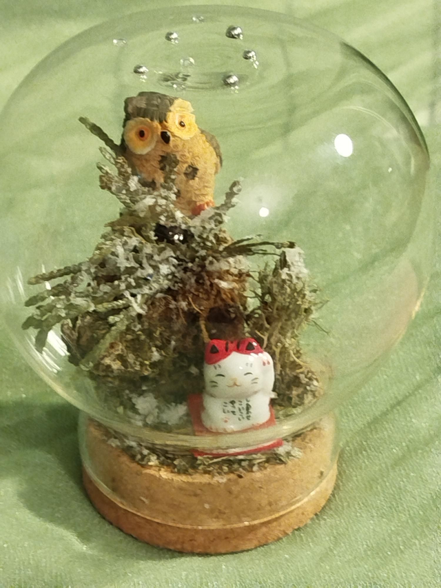 Golden verre 10*11, végétaux séchés et figurines en résine ou porcelaine.