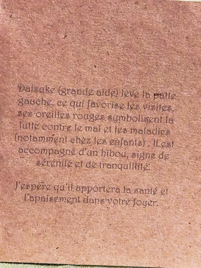 Chaque maneki neko de cette collection a son prénom et sa signification et est accompagné de sa fiche signalétique.
