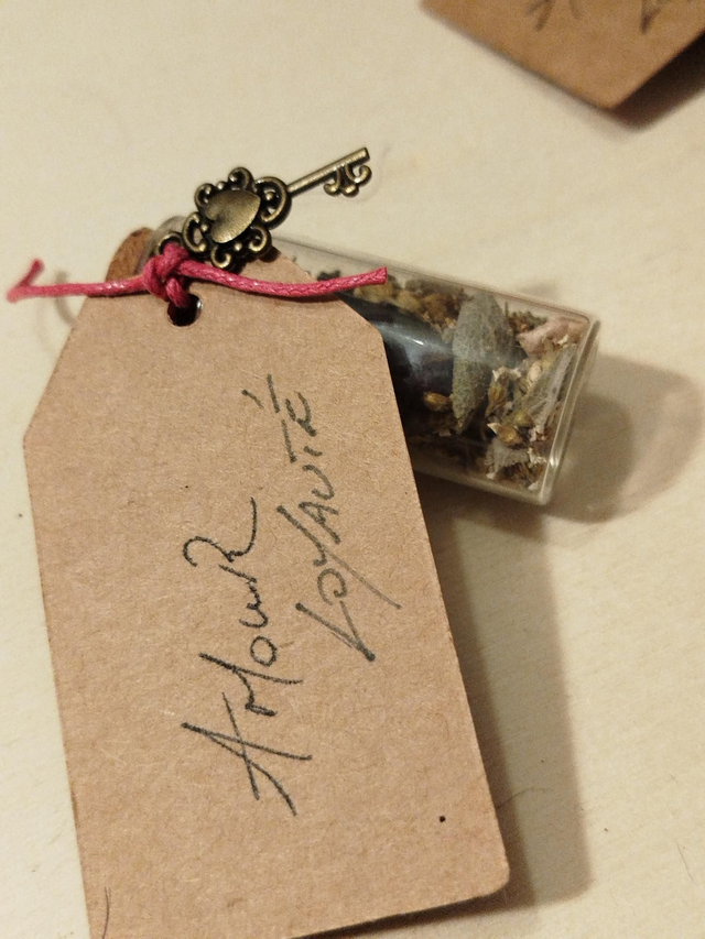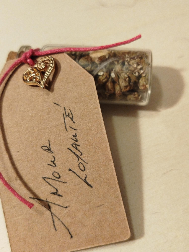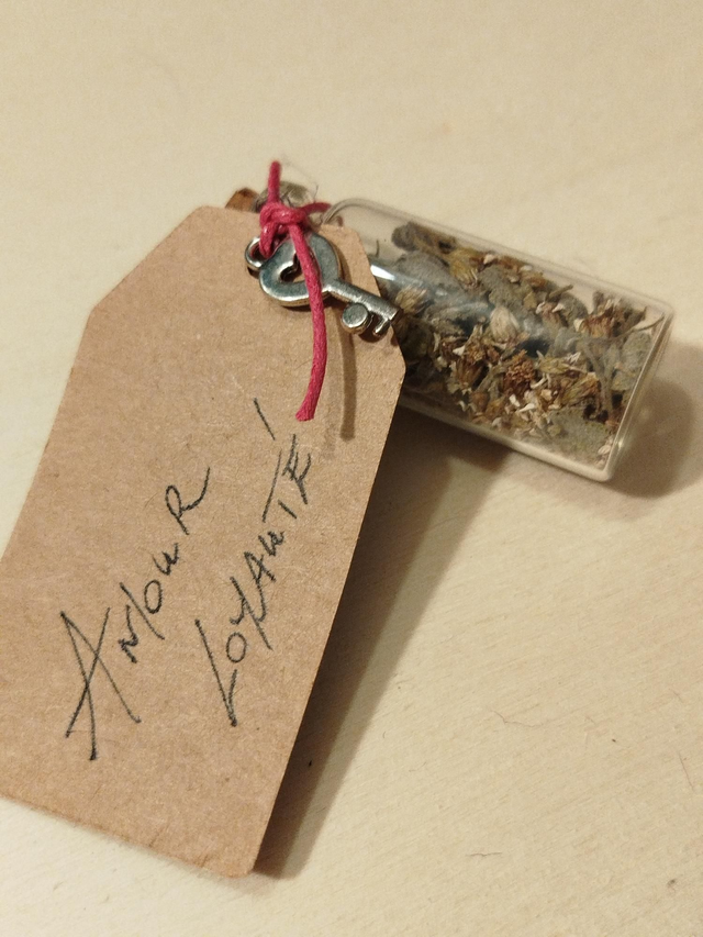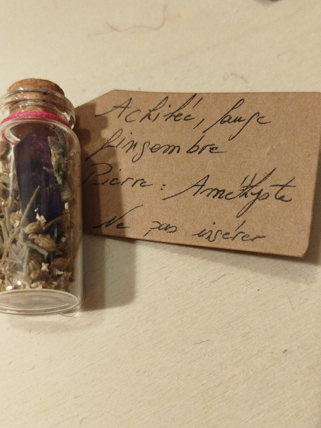 Fiole en verre et bouchon liège 6cm avec mélange de végétaux séchés et pierre en rapport avec l'énoncé de l'étiquette.
