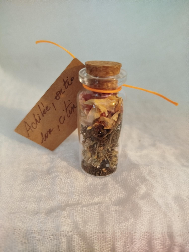Fiole en verre et bouchon liège 6cm avec mélange de végétaux séchés et pierre en rapport avec l'énoncé de l'étiquette.