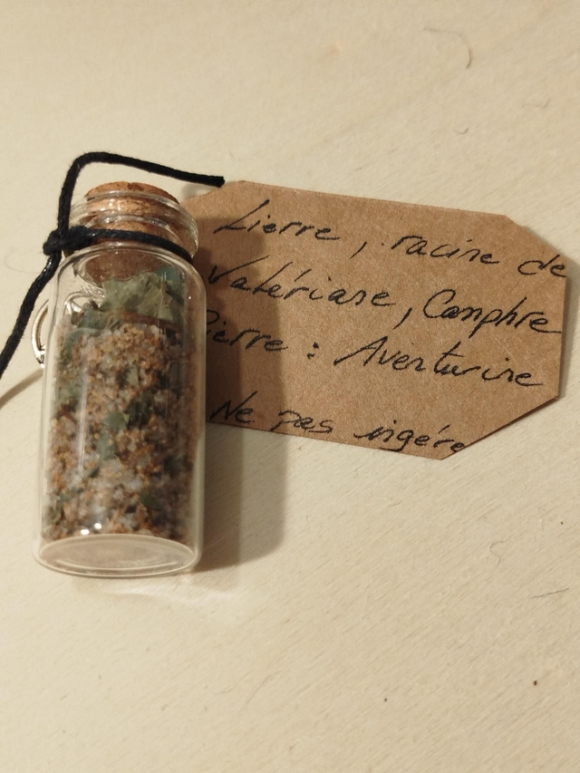Fiole en verre et bouchon liège 6cm avec mélange de végétaux séchés et pierre en rapport avec l'énoncé de l'étiquette.