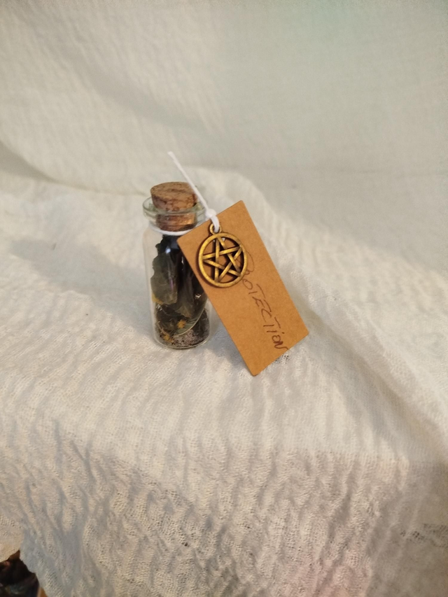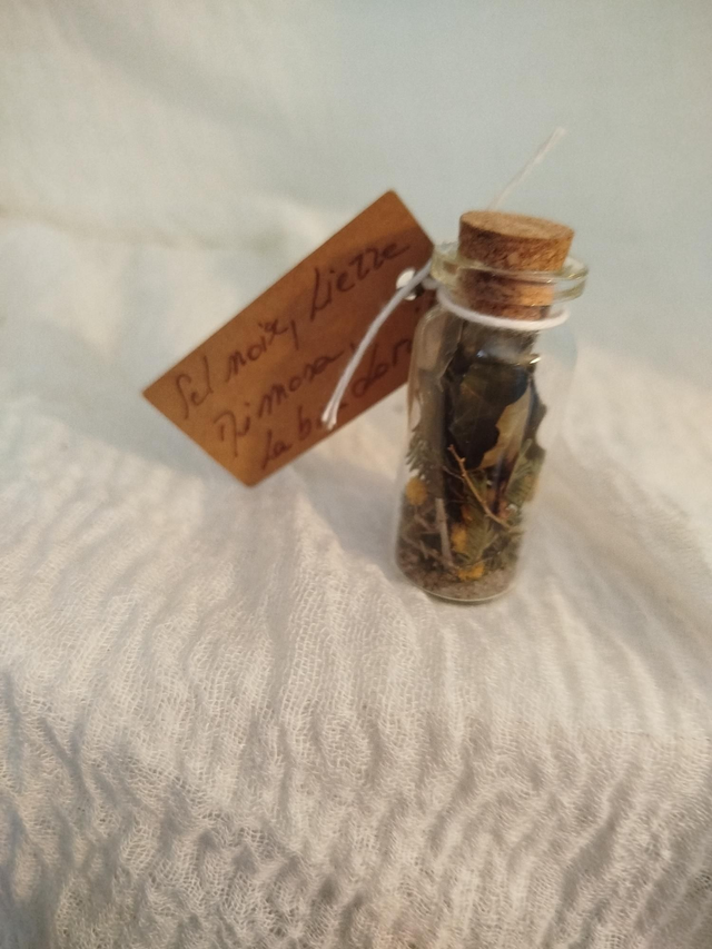 Fiole en verre et bouchon liège 6cm avec mélange de végétaux séchés et pierre en rapport avec l'énoncé de l'étiquette.