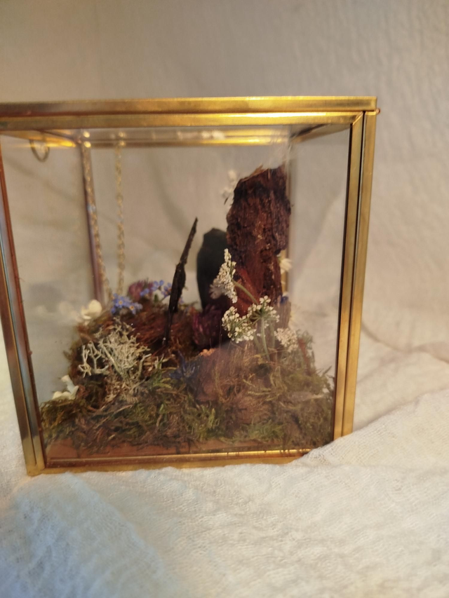 Boite en verre et métal doré, végétaux récoltés et séchés sur place, papillon naturalisé sur place