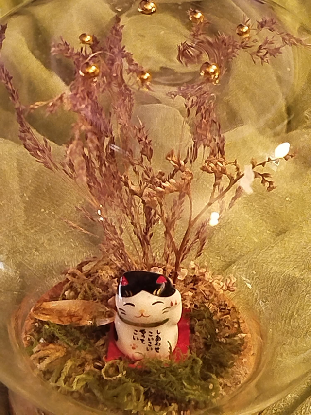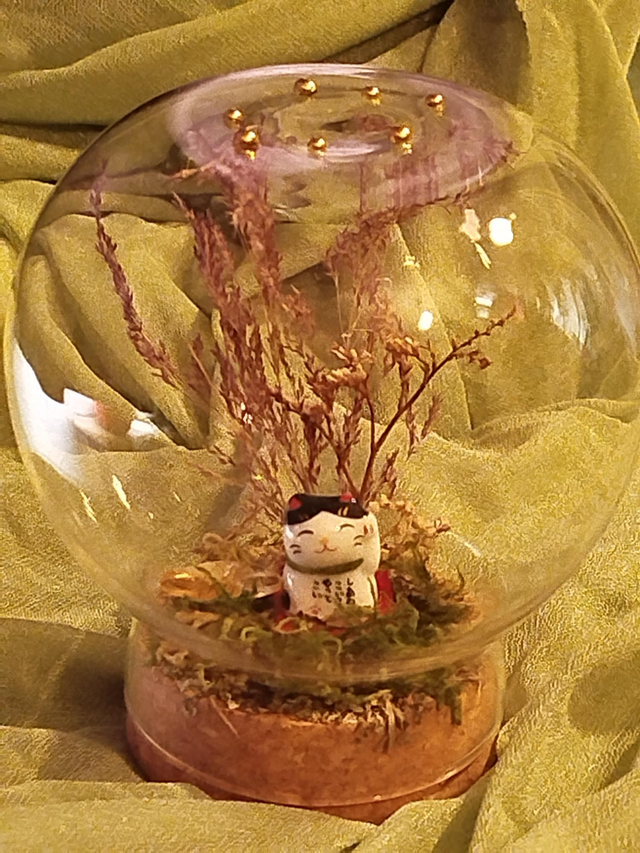 Golden verre environ 10*11, végétaux séchés et figurines en résine ou porcelaine.