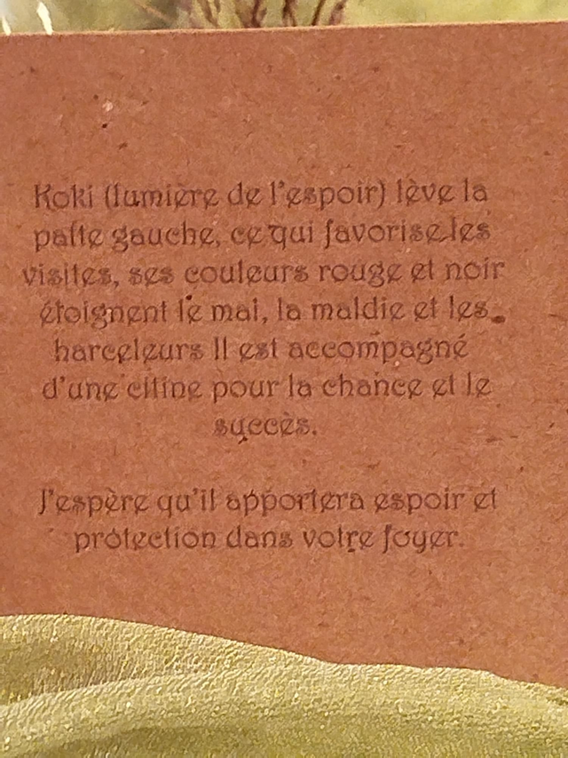 Chaque maneki neko de cette collection a son prénom et sa signification et est accompagné de sa fiche signalétique.