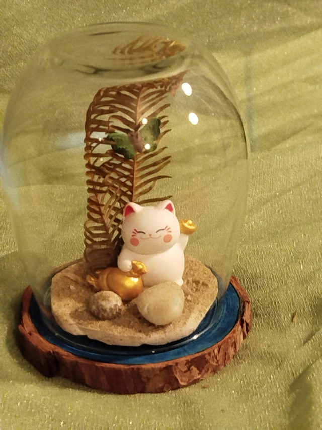 Golden verre environ 10*11, végétaux séchés et figurines en résine ou porcelaine.