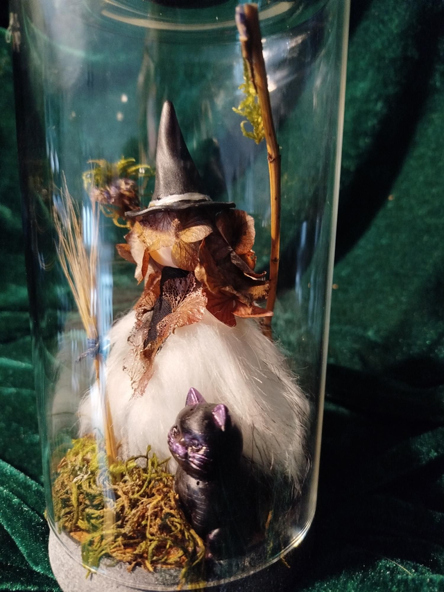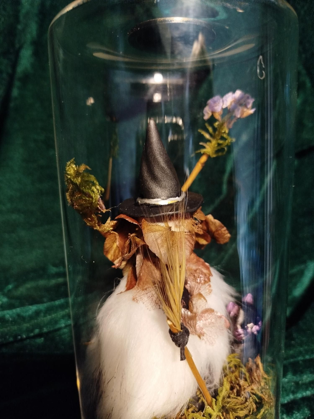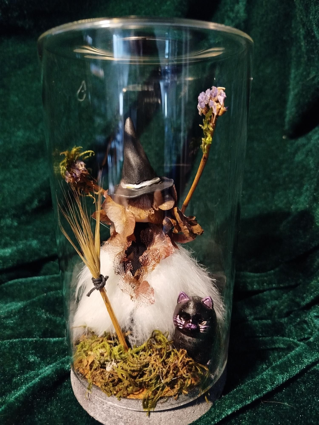 Globe verre et bois ou liège, h12cm* diamètre 8cm , pâte polymère, tissus, résine et végétaux séchés