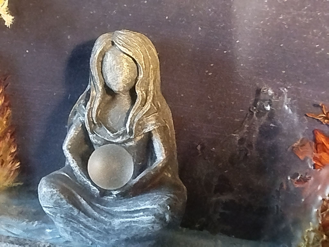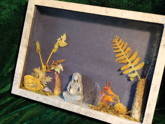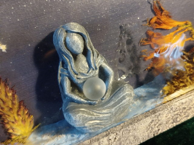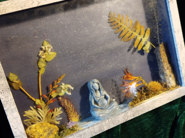 Fond aquarelle, personnage et éléments en résine, décor végétaux séchés et éléments naturels