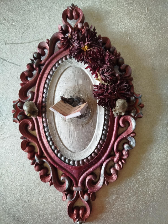 Socle bois, peinture acrylique, inclusion résine, tissus et végétaux naturels récoltés et séchés sur place.