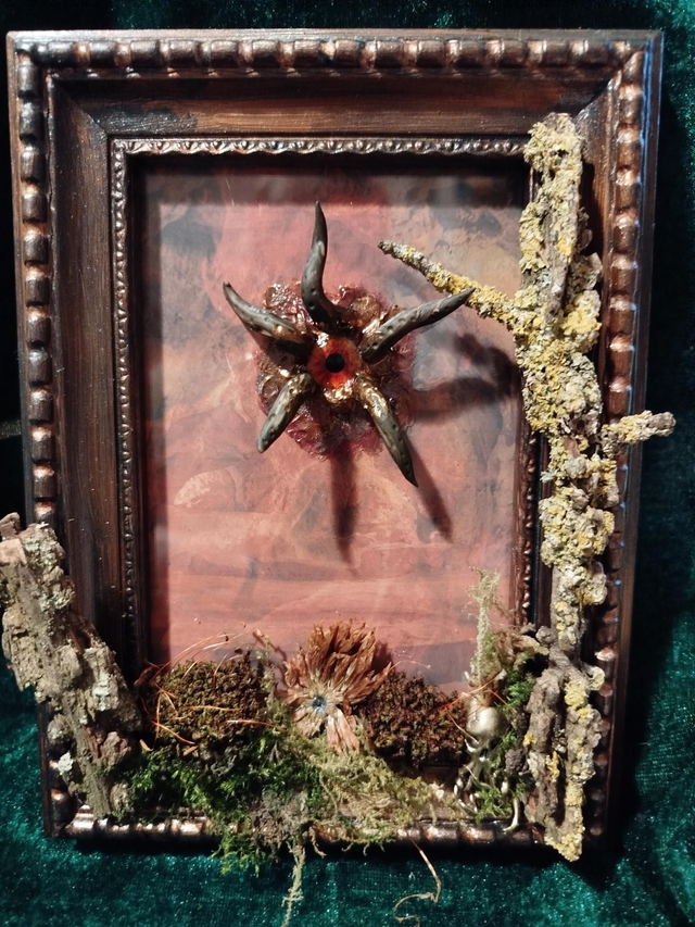 Cadre bois seconde main retravaillé, peinture acrylique, montage photos crédit Séverine André, végétaux séchés sur place, pâte polymère.