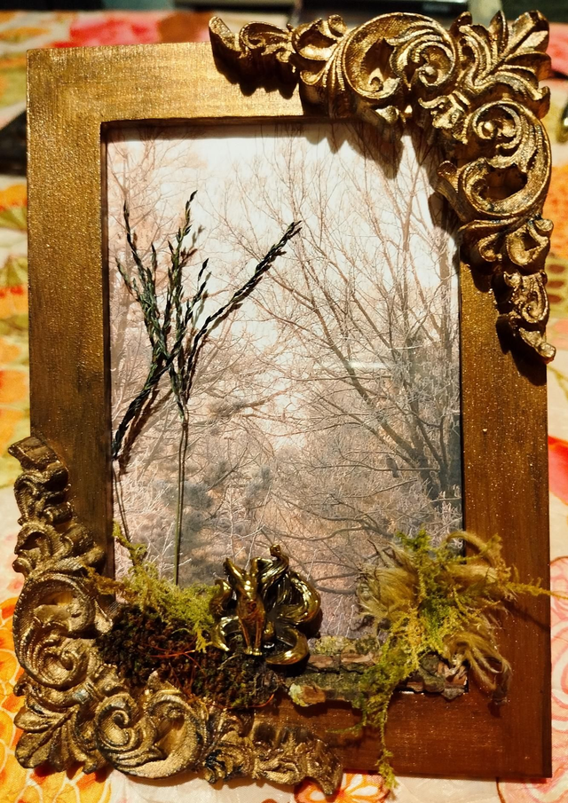Cadre bois 10*15, peinture acrylique, végétaux récoltés et séchés sur place, photo crédit Séverine André, personnage laiton.