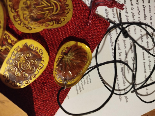 Jeux de 13 runes de sorcière en résine et fleurs récoltées et séchées sur place, accompagnés d'un sac de rangement, feuillet explicatif et médaillon assorti.