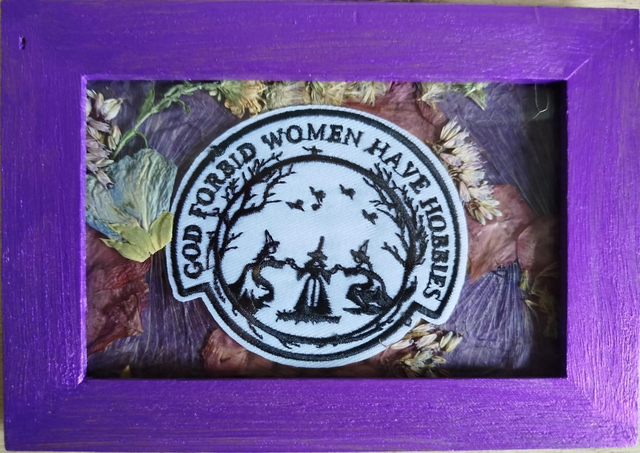 Cadre bois, peinture acrylique, végétaux récoltés et séchés sur place, patch brodé. Environ 12cm.