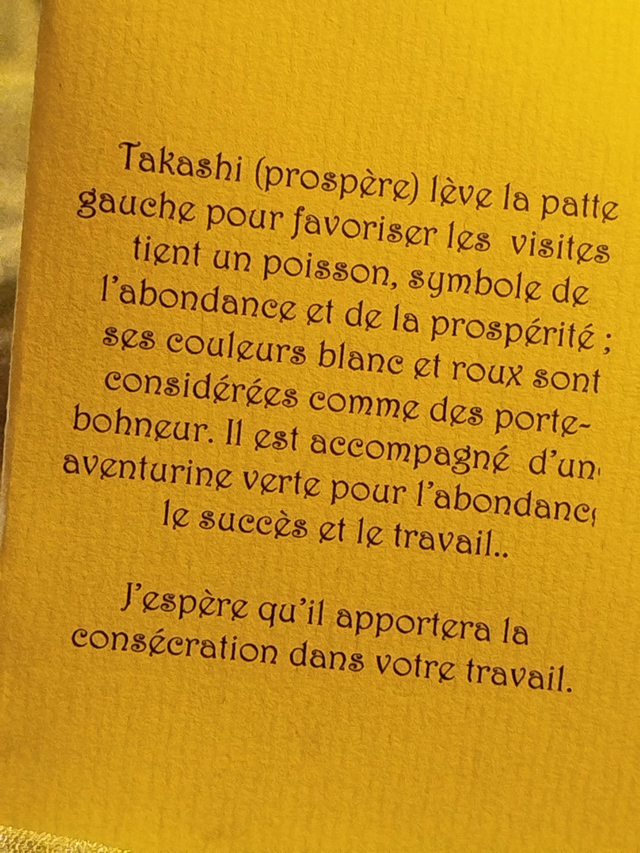 Chaque maneki neko de cette collection a son prénom et sa signification et est accompagné de sa fiche signalétique.