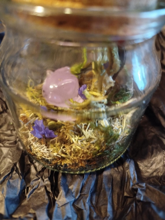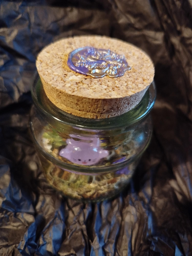 Végétaux récoltés et séchés sur place, petit animal en résine phosphorescente, sceau cire.