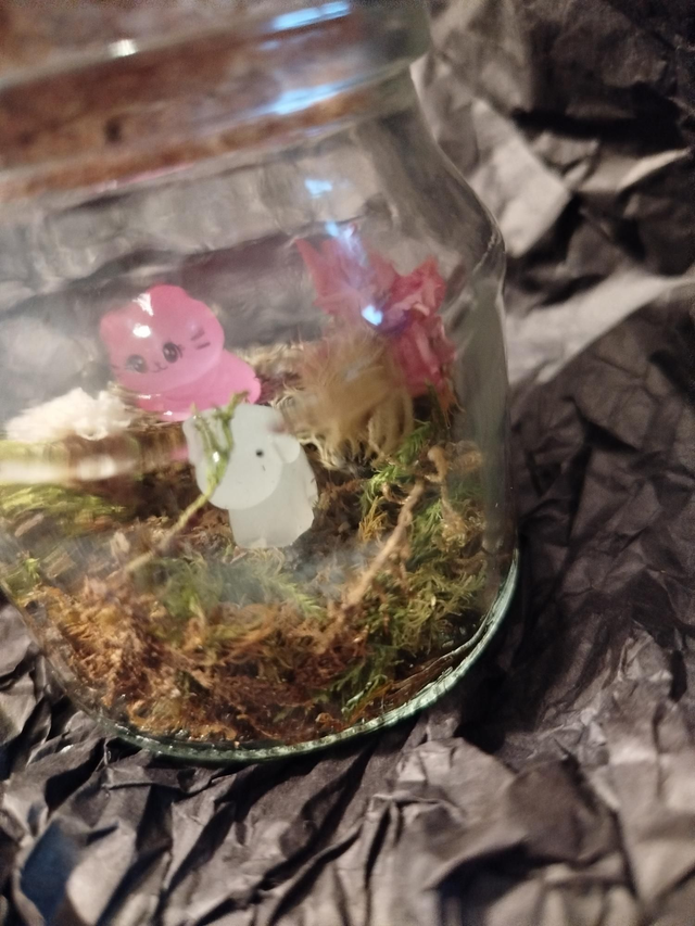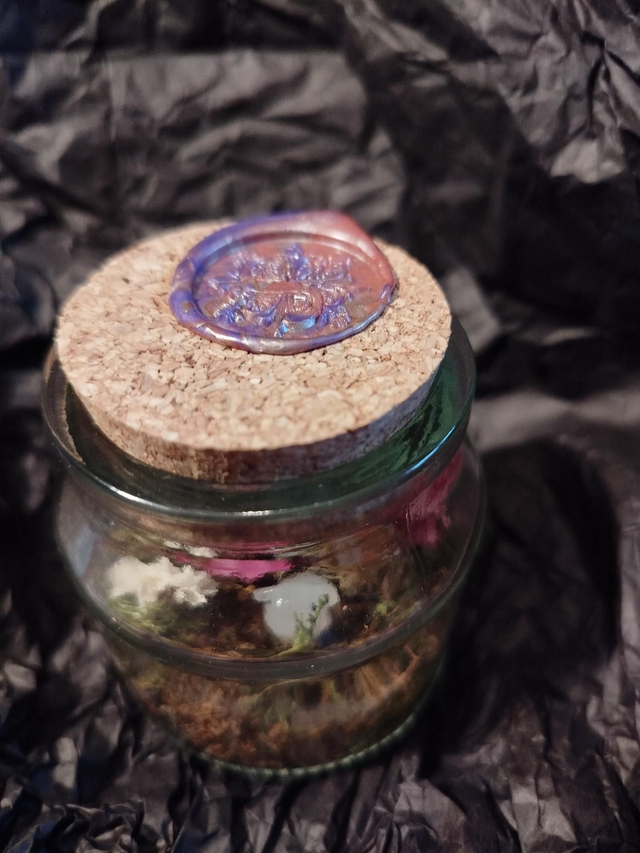 Végétaux récoltés et séchés sur place, petit animal en résine phosphorescente, sceau cire.