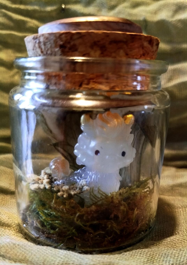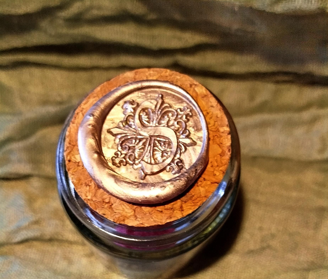 Végétaux récoltés et séchés sur place, petit animal en résine phosphorescente, sceau cire.