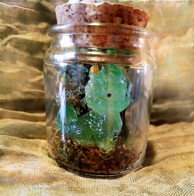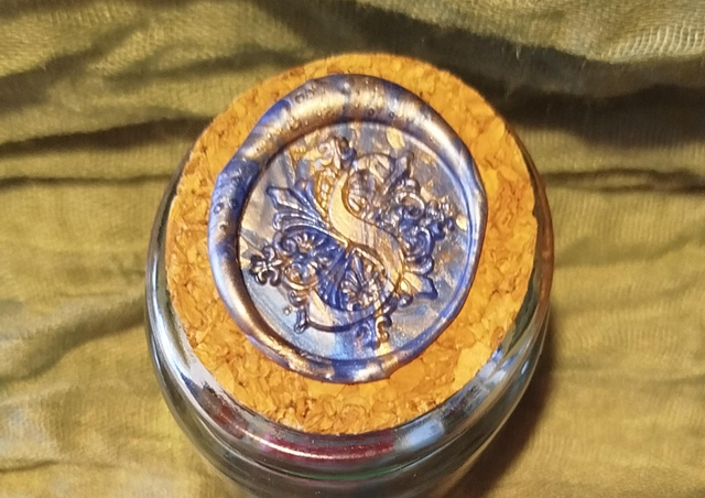 Végétaux récoltés et séchés sur place, petit animal en résine phosphorescente, sceau cire.