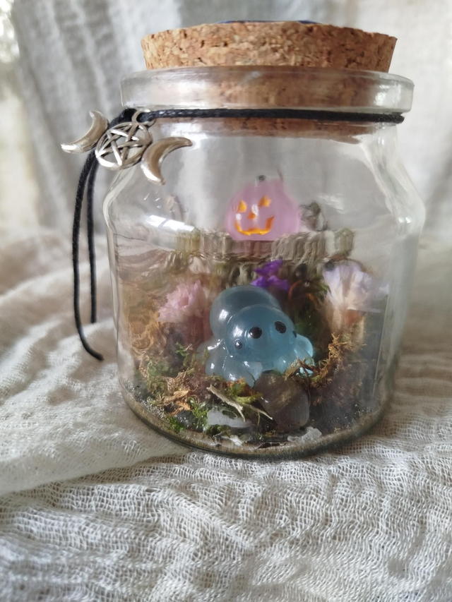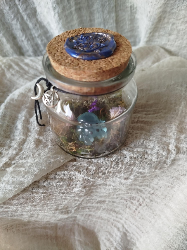 Végétaux récoltés et séchés sur place, petit animal en résine phosphorescente, sceau cire.