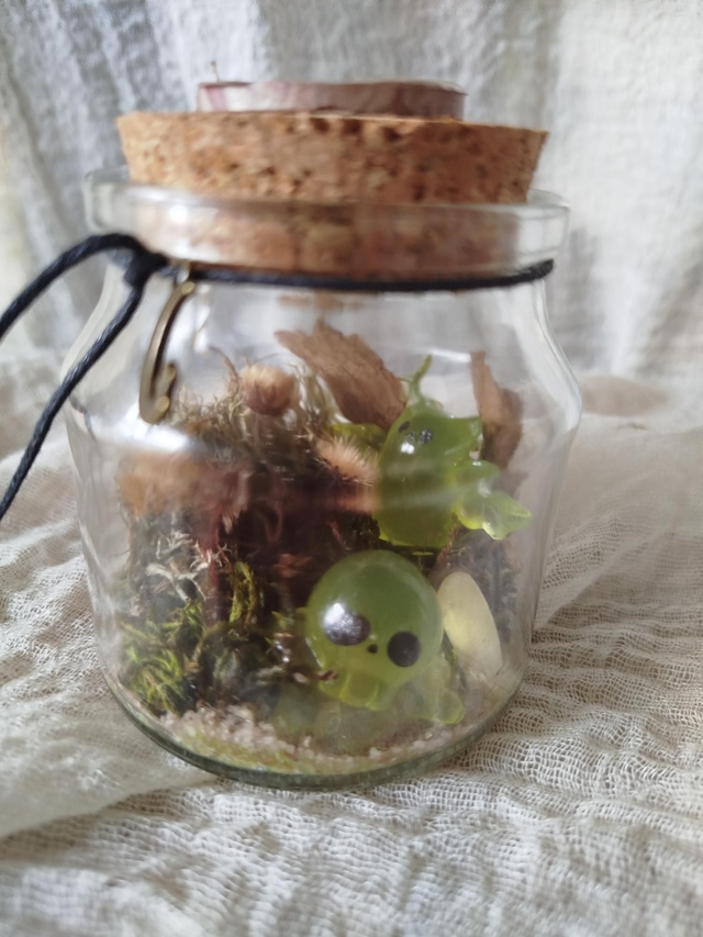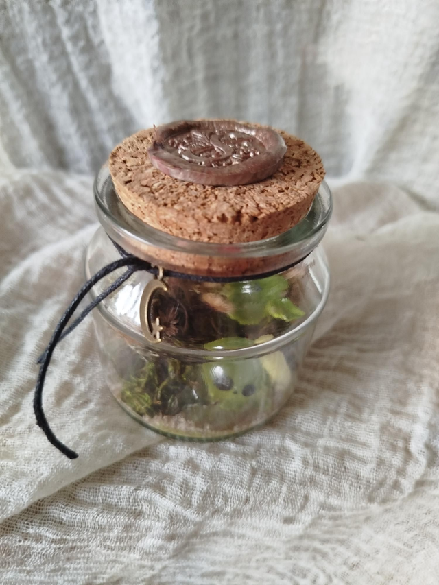 Végétaux récoltés et séchés sur place, petit animal en résine phosphorescente, sceau cire.