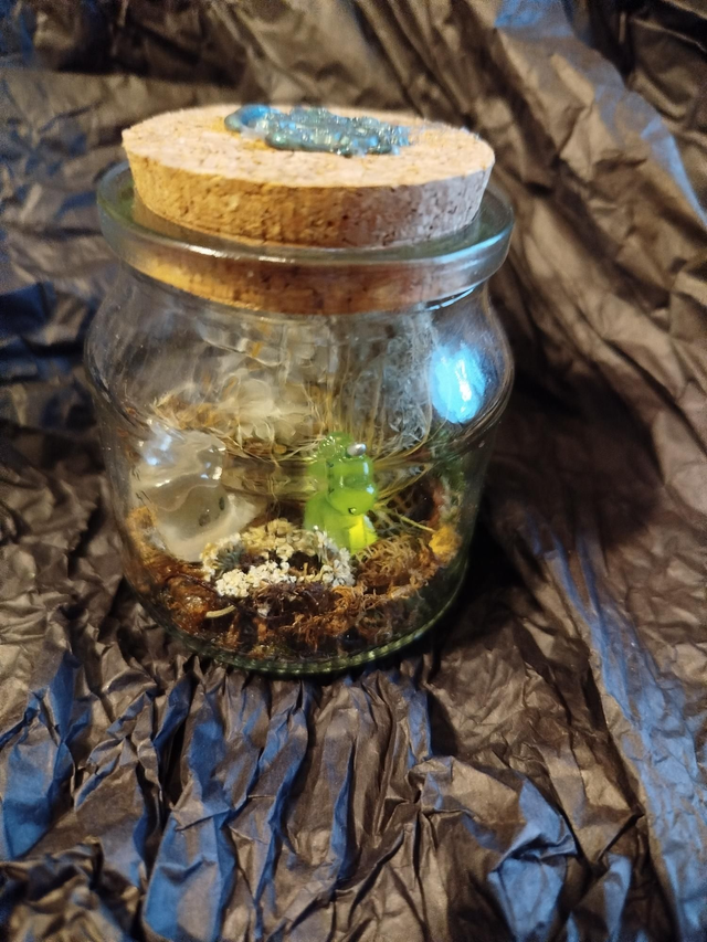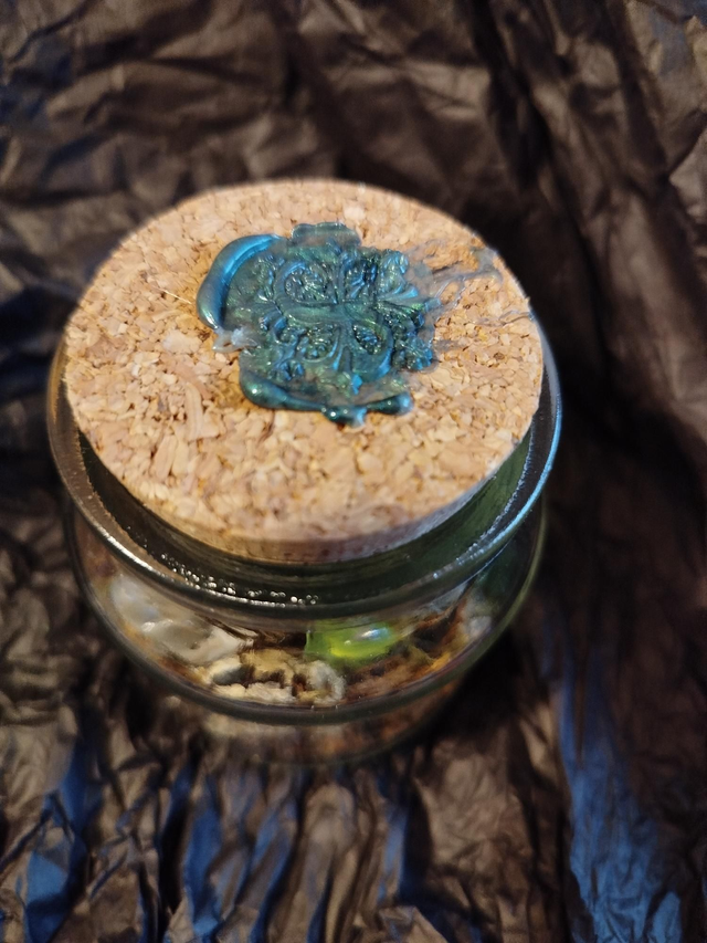 Végétaux récoltés et séchés sur place, petit animal en résine phosphorescente, sceau cire.