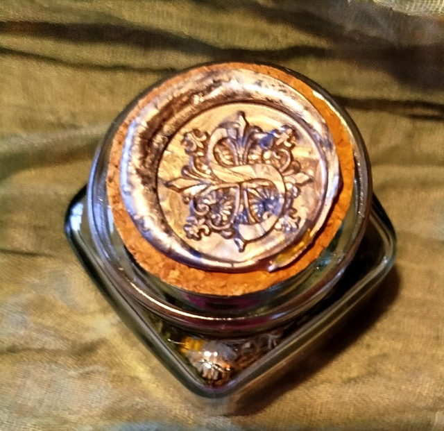Végétaux récoltés et séchés sur place, petit animal en résine phosphorescente, sceau cire.