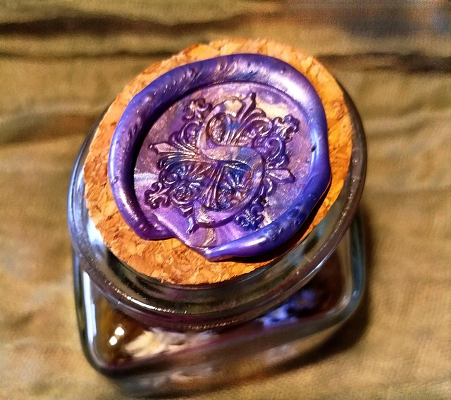 Végétaux récoltés et séchés sur place, petit animal en résine phosphorescente, sceau cire.