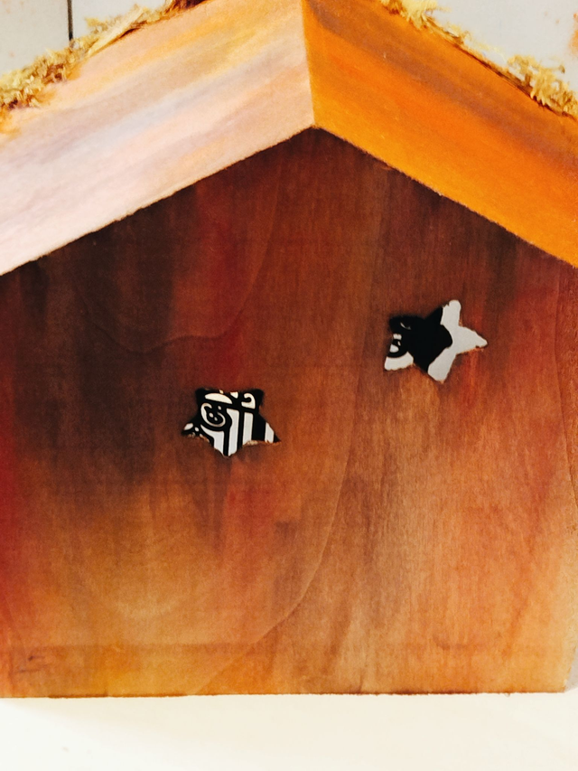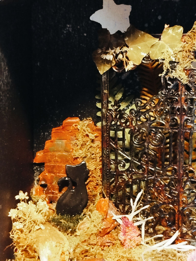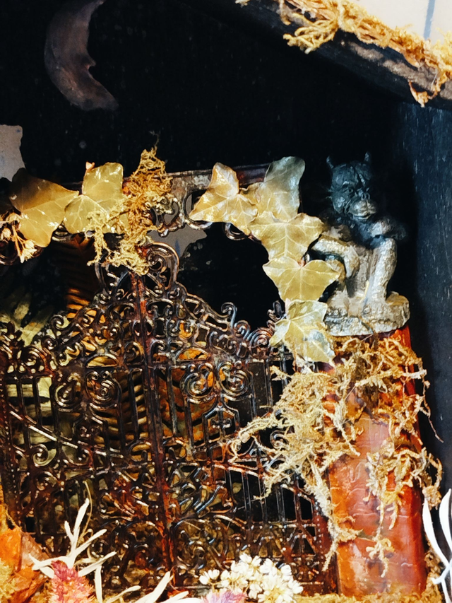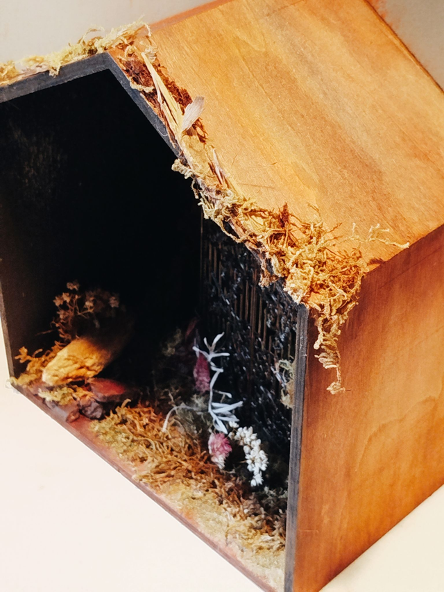 Boite en pin, aquarelle et acrylique, argile, végétaux séchés, coquillage, éléments du décor en fer et