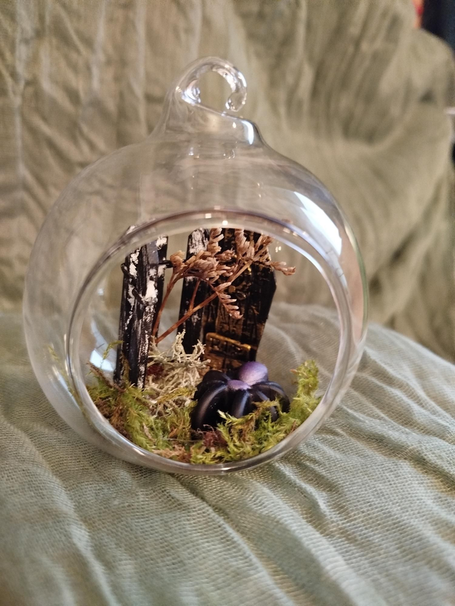 Boule en verre 8cm, décor végétaux séchés et scènes variées ( résine, pâte polymère... Dépend des modèles), vendu avec son pied noir