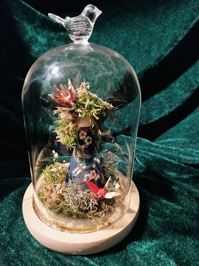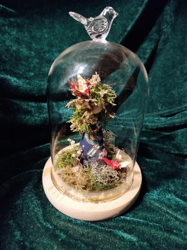 Globe verre, socle bois 17*9, tissus, pâte polymère, végétaux séchés, papier